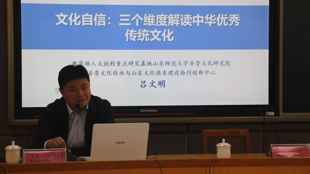 11月1日上午,烟台海阳市教体局在烟台市中英文学校举行了“弘扬传统文化,推进品质教育”现场观摩活动暨学术报告会,我院吕文明教授应邀为在场的市教体局班子成员、机关科室中层以上干部、中小学校长和烟台市中英文学校青年教师等近200人作了题为“文化自信:三个维度解读中华优秀传统文化”的专题讲座。讲座由海阳市委教育工委常务副书记、海阳市教体局党组书记、局长纪卫东主持。
