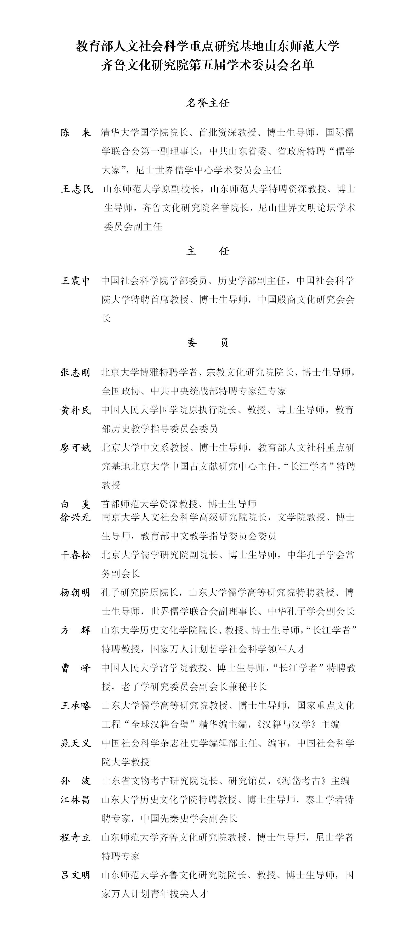 教育部人文社会科学重点研究基地 山东师范大学齐鲁文化研究院第五届学术委员会名单