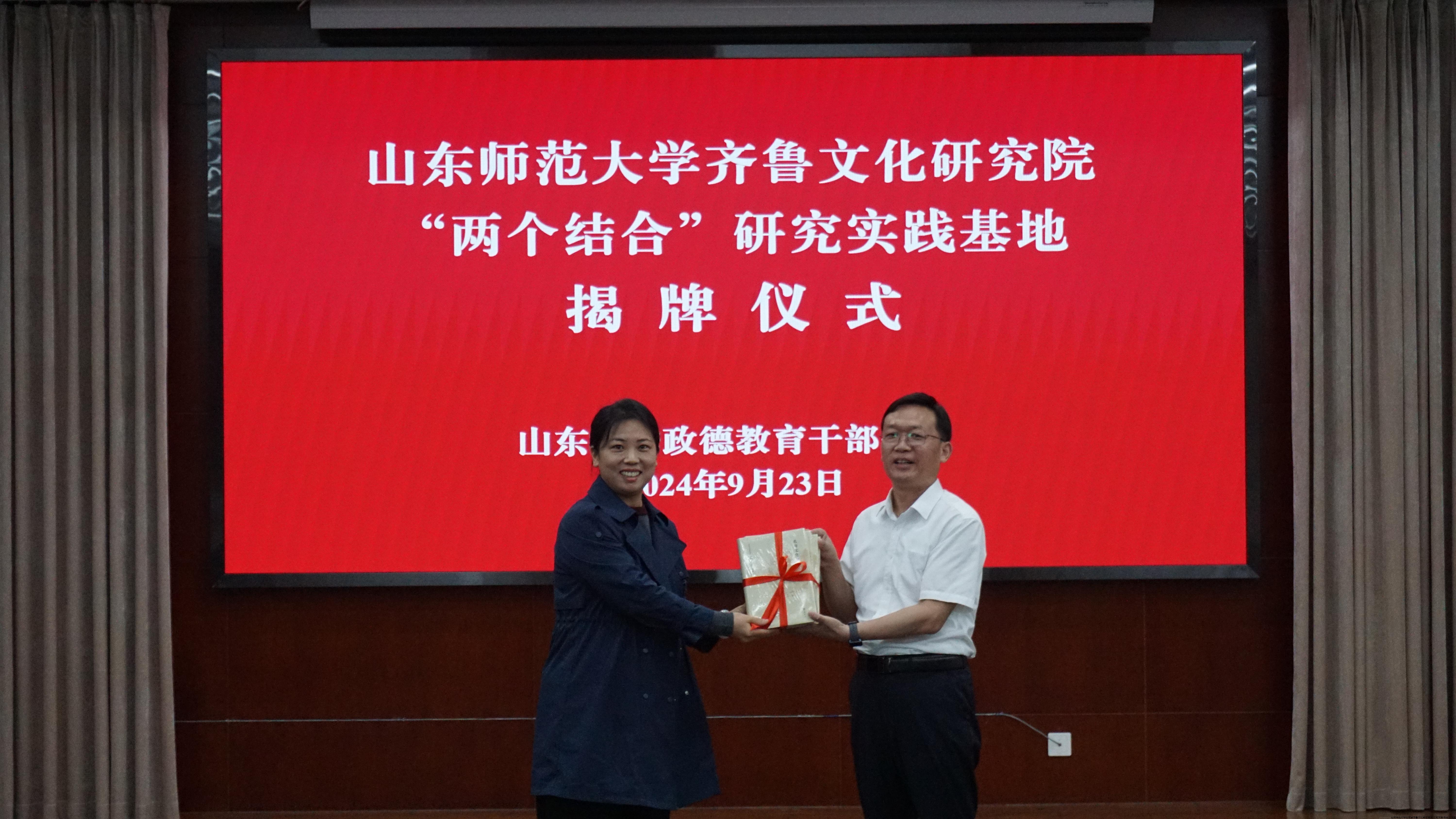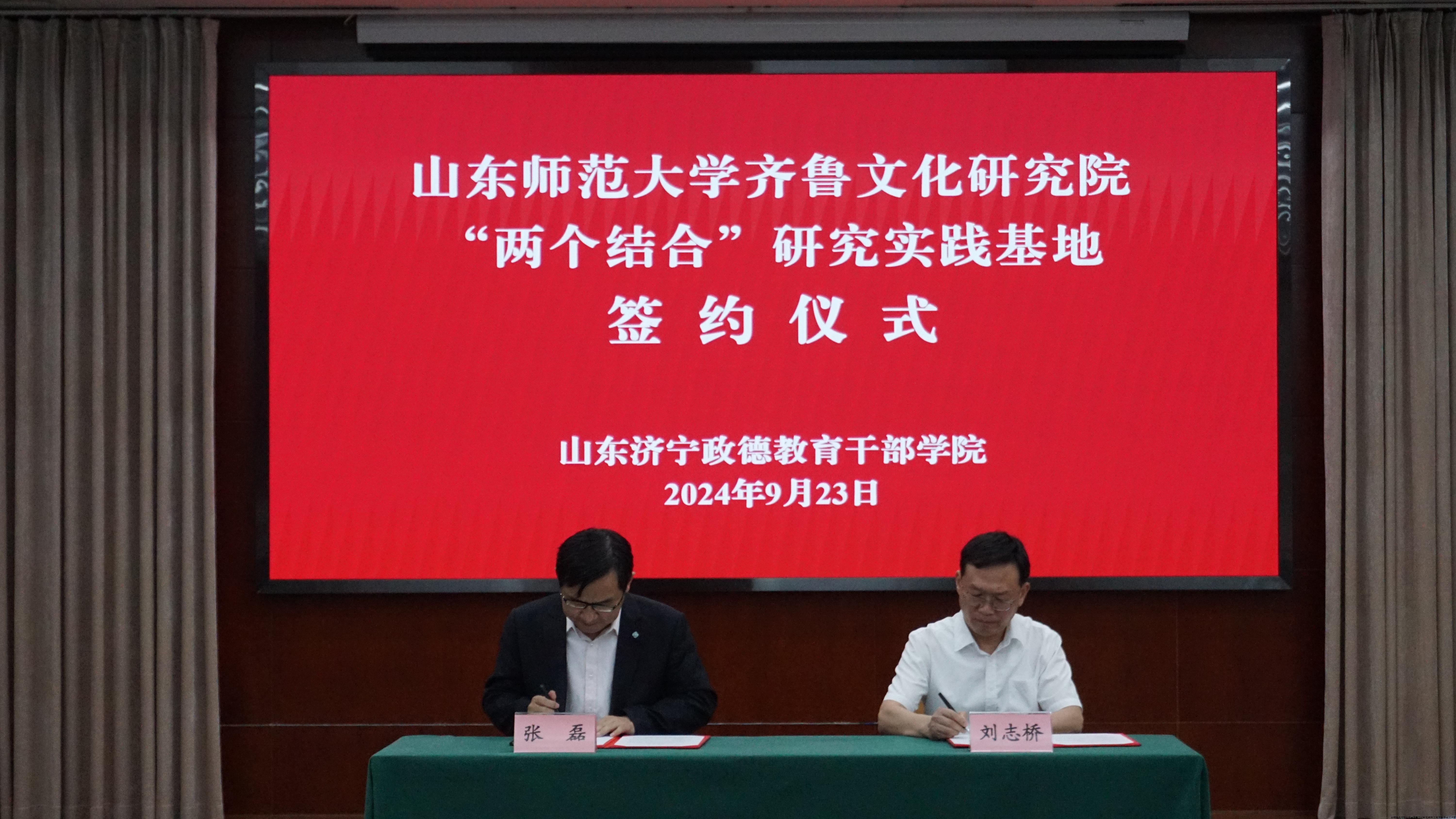 9月23日上午,山东师范大学齐鲁文化研究院与山东济宁政德教育干部学院签约揭牌仪式在山东曲阜举行,齐鲁文化研究院院长吕文明、山东济宁政德教育干部学院院长白占德共同为“山东师范大学齐鲁文化研究院‘两个结合’研究实践基地”揭牌。齐鲁文化研究院副院长张磊、李莉,以及双方有关同志出席揭牌仪式。揭牌仪式由山东济宁政德教育干部学院副院长刘志桥主持。