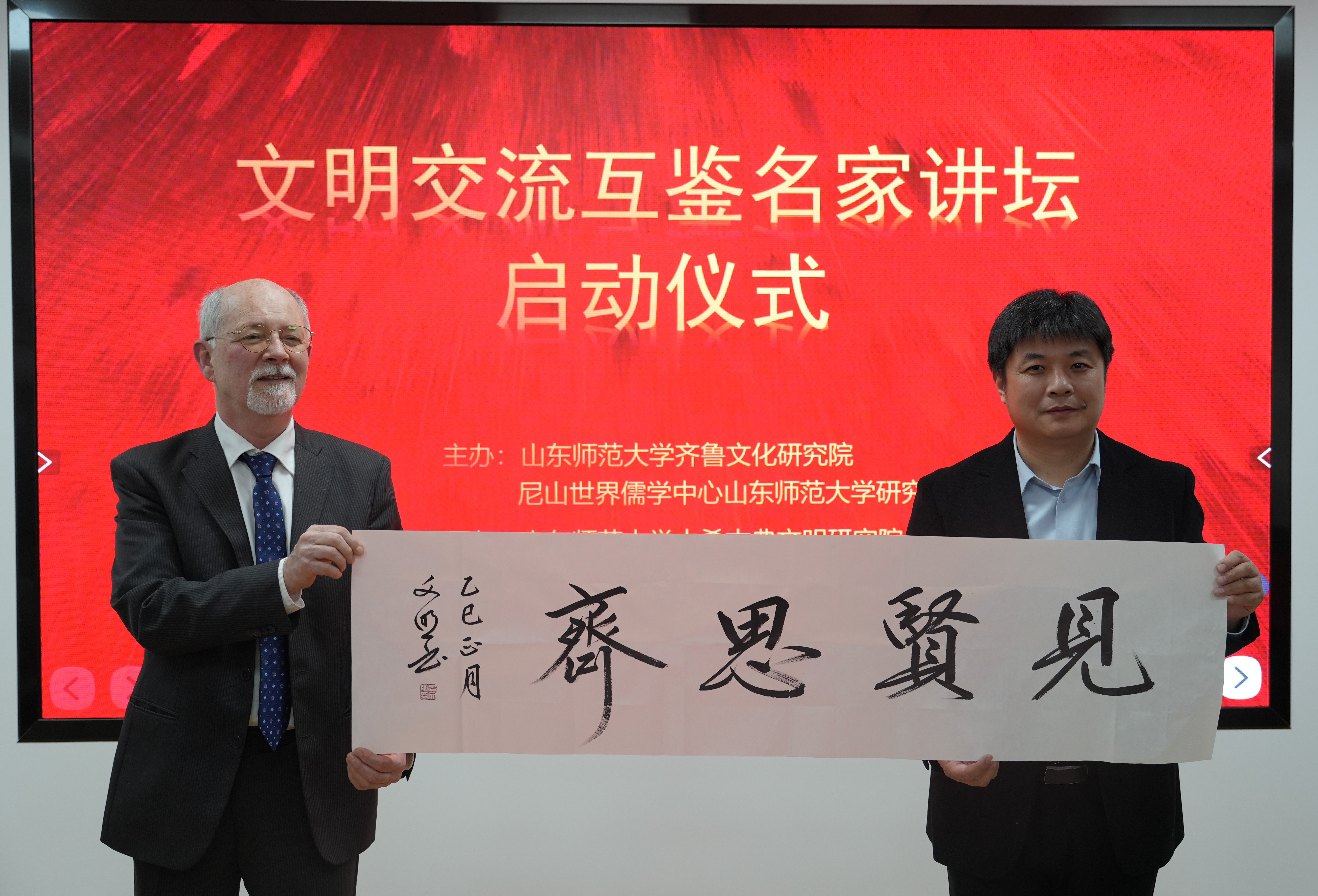 吕文明院长对布兰科·巴隆教授莅临齐鲁文化研究院表示欢迎,向布兰科·巴隆教授进介绍了齐鲁文化研究院的建设发展情况,指出研究院高度重视对外文化交流,积极促进中外文明交流互鉴。吕文明院长代表齐鲁文化研究院向布兰科·巴隆教授赠送了“见贤思齐”的书法作品与齐鲁文化研究院成立25周年纪念品,并举行了文明交流互鉴名家讲坛启动仪式。