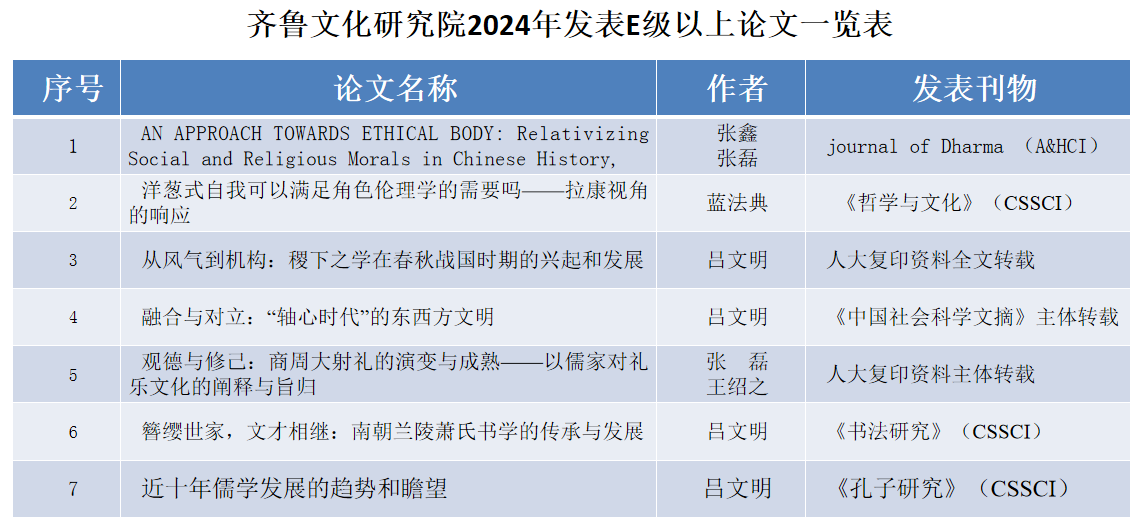 一是吕文明在2024年省政府工作报告专家征求意见会上提出的“关于贯彻落实习近平文化思想,弘扬和传承齐鲁优秀文化,深入推进文化‘两创’”相关建议,得到省政府主要领导同志肯定,被《2024年山东省政府工作报告》采用。二是承担省委宣传部重大项目《中华优秀传统文化精华研究丛书》(10卷),编纂出版《山东人文沃土优势》。三是出版《齐鲁文化与中华文明学术公开课》(第三辑),继续开展《齐鲁文化与中华文明》学术公开课活动。四是继续开展品牌学术活动“齐鲁文化论坛”,目前已成功举办161期。五是推动文明交流互鉴,在商务印书馆出版《文明互鉴视阈下的儒家思想与齐鲁文化》。