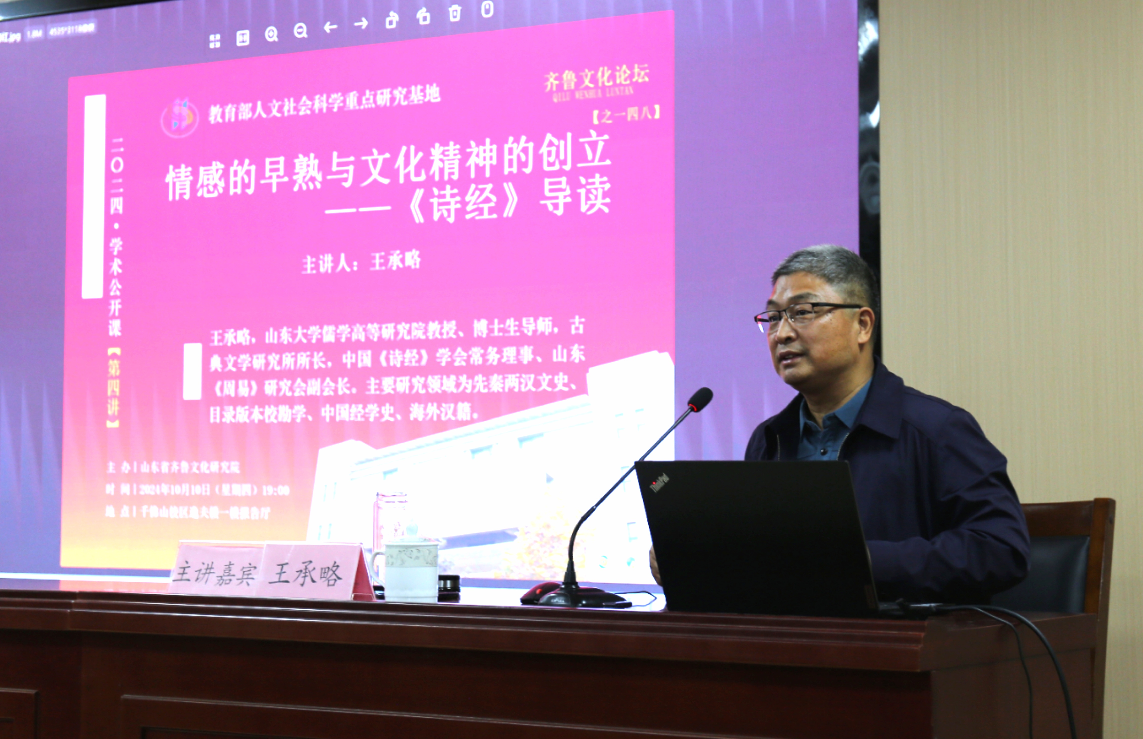 10月10日晚,由教育部人文社会科学重点研究基地山东师范大学齐鲁文化研究院主办的“齐鲁文化与中华文明”学术公开课第四讲暨齐鲁文化论坛第一百四十八期《情感的早熟与文化精神的创立——〈诗经〉导读》,在山东师范大学千佛山校区逸夫楼报告厅举行。本次公开课由山东大学博士生导师王承略教授担任主讲嘉宾,齐鲁文化研究院师生、千佛山校区部分本科生参加了本次讲座。讲座由齐鲁文化研究院党委书记颜春杰主持。