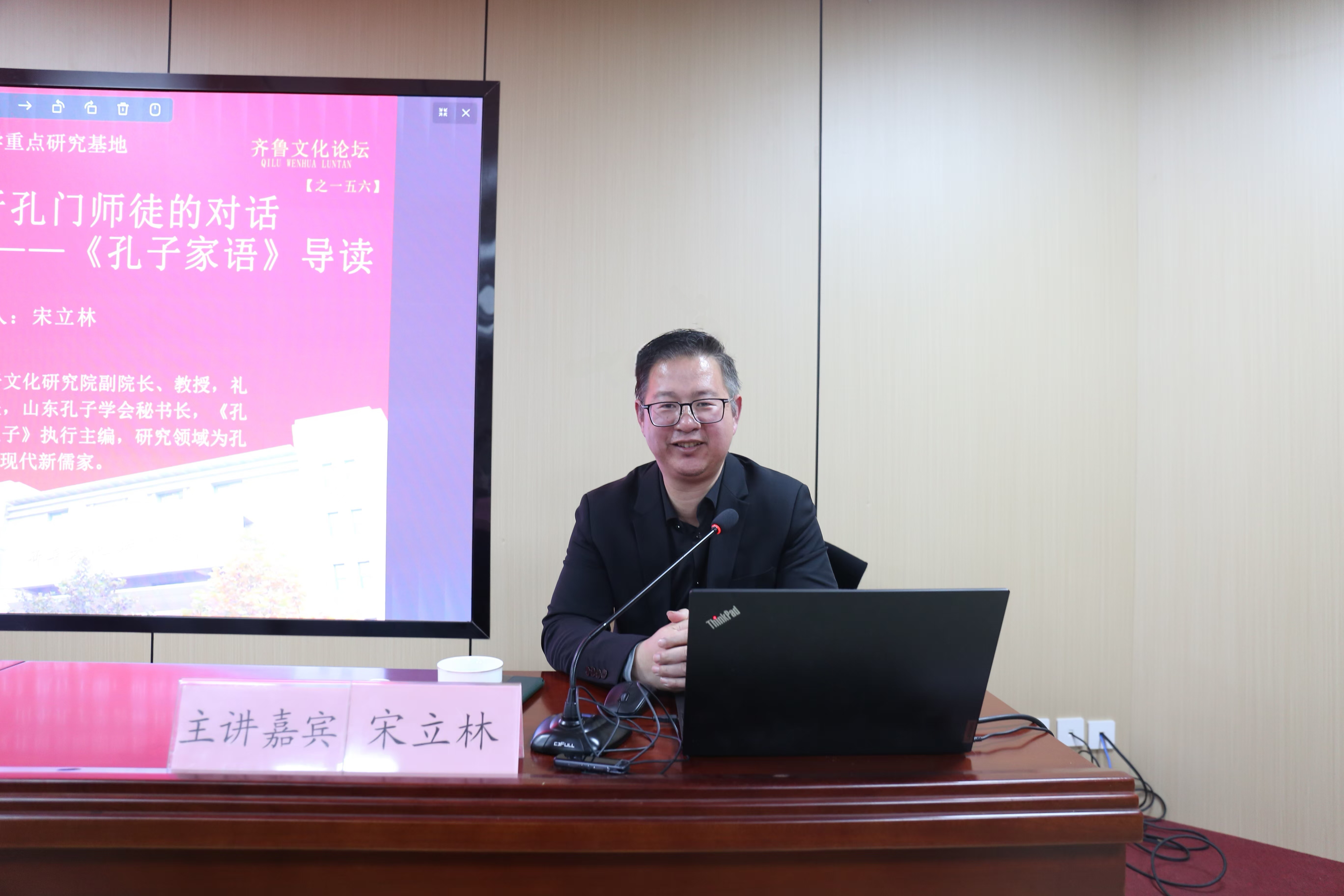 11月21日晚,由教育部人文社会科学重点研究基地山东师范大学齐鲁文化研究院主办的齐鲁文化论坛第一百五十六期暨“齐鲁文化与中华文明”学术公开课第十讲《宝典重光:倾听孔门师徒的对话——<孔子家语>导读》在山东师范大学千佛山校区逸夫楼报告厅举行。本次公开课由曲阜师范大学孔子文化研究院副院长宋立林教授担任主讲嘉宾,齐鲁文化研究院师生、千佛山校区部分本科生参加了本次讲座。讲座由齐鲁文化研究院副院长张磊教授主持。