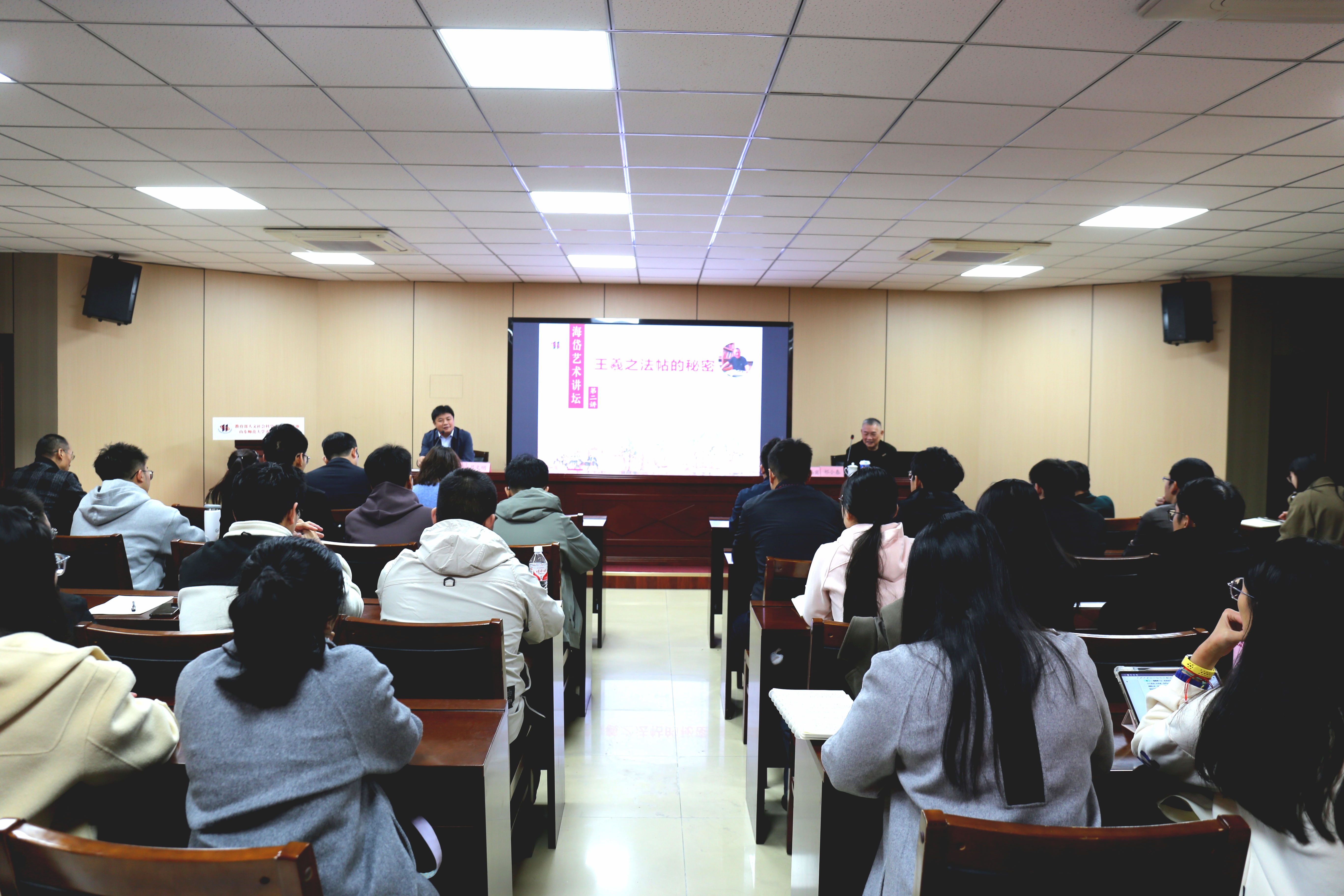 10月21日上午,由教育部人文社会科学重点研究基地山东师范大学齐鲁文化研究院、山东师范大学社会科学处主办的“海岱艺术讲坛”第二期暨社科大讲坛之一四三九期《王羲之法帖的秘密》,在山东师范大学千佛山校区逸夫楼报告厅举行。本次讲座由中国人民大学吴玉章讲席教授祁小春老师担任主讲嘉宾,校内外百余名师生参加了本次讲座。讲座由齐鲁文化研究院院长吕文明教授主持。